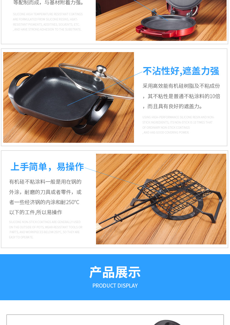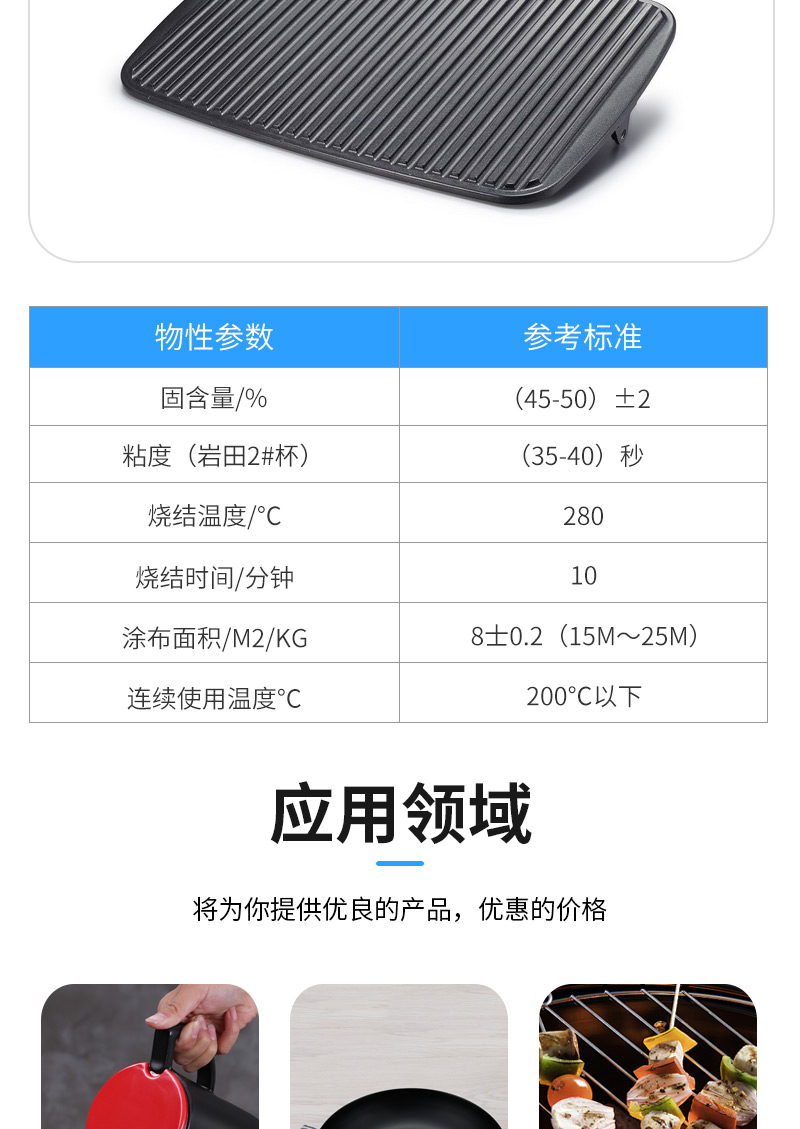 1,防粘性能:使用本涂料形成的炊具内涂层,在烙饼、炒蛋、煎鱼、煮奶时不粘且易于清洗;